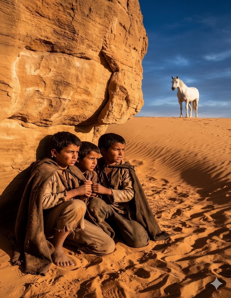 - Sa druge strane, u tom trenutku, sa vrha dina, pojavio se neobičan prizor. Beli konj, snažan i nepokolebljiv, stajao je posmatrajući celu scenu. Nije bio samo prolaznik ili nepažljiv posmatrač; on je bio svesni svedok onoga što se upravo dogodilo. Zatim, kao što je instinktivno delovao, pozvao je decu da mu priđu. Iako iscrpljena, deca su osetila da nešto u tom trenutku može da im pruži nadu. S naporom, svako od njih popelo se na konja, a on je, svestan odgovornosti, krenuo ka mestu koje bi im moglo spasiti živote — ranger stanici.
