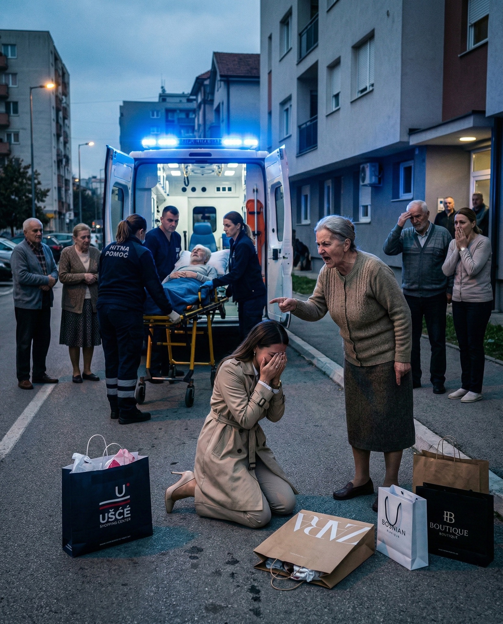 Slavica je pokušala izdržati sama. Napravila je nekoliko koraka prema kuhinji, ali joj se zavrtjelo. Tijelo joj je otkazalo poslušnost i srušila se na hladne pločice. U stanu je zavladala tišina.Tri sata kasnije, dok je Slavica ležala bez svijesti, Tijana je sjedila u kafiću, smijala se i kupovala novu odjeću. Nije ni pomislila da nazove majku. A onda je, vraćajući se kući, zatekla prizor koji joj je promijenio život – ispred zgrade je stajalo vozilo hitne pomoći, komšije okupljene, a na nosilima njena majka, priključena na kiseonik.