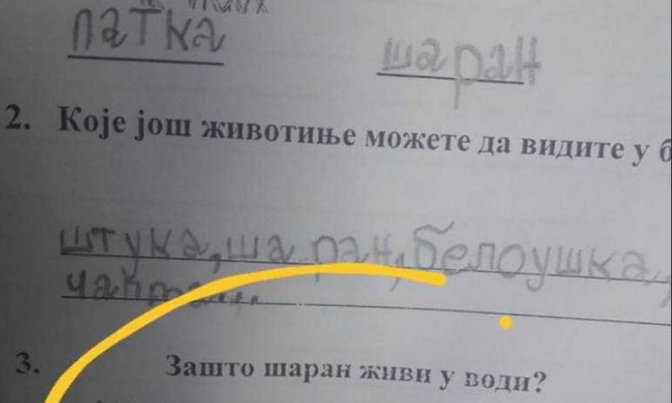 U jednom beogradskom razredu osnovne škole dogodila se scena koja je nasmijala regiju i podsjetila nas na nevjerojatnu iskrenost djece. Naime, tijekom testa iz predmeta „Svijet oko nas“, učitelj je postavio jednostavno pitanje: “Zašto šaran živi u vodi?”