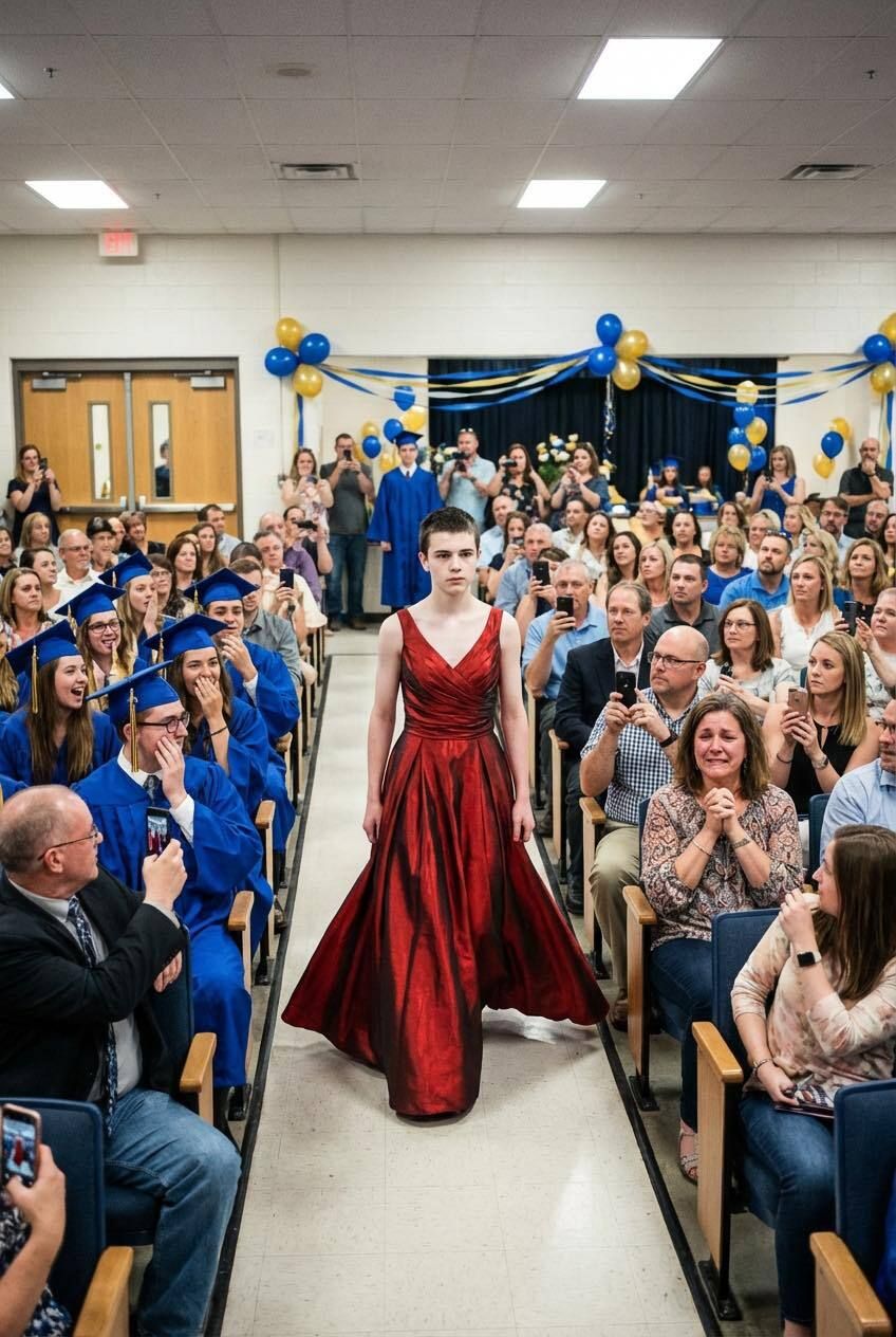 • Kada je došla noć mature, sala je bila ispunjena zvucima aplauza, šuškanjem svečanih haljina i ponosnim pogledima roditelja. A onda ga je ugledala. Njen sin nije nosio klasičnu matursku odoru. Umjesto toga, na sebi je imao dugu, lepršavu crvenu haljinu od tkanine koja je hvatala svjetlost reflektora. Hodao je uspravno, bez oklijevanja, s mirnom sigurnošću koja ju je istovremeno paralisala i ispunila divljenjem. Reakcije publike bile su brze i nemilosrdne – šaputanja, smijeh, komentari i podignuti telefoni. U njoj se probudio snažan poriv da ga zaštiti, ali ostala je sjediti, dok je on koračao prema pozornici.