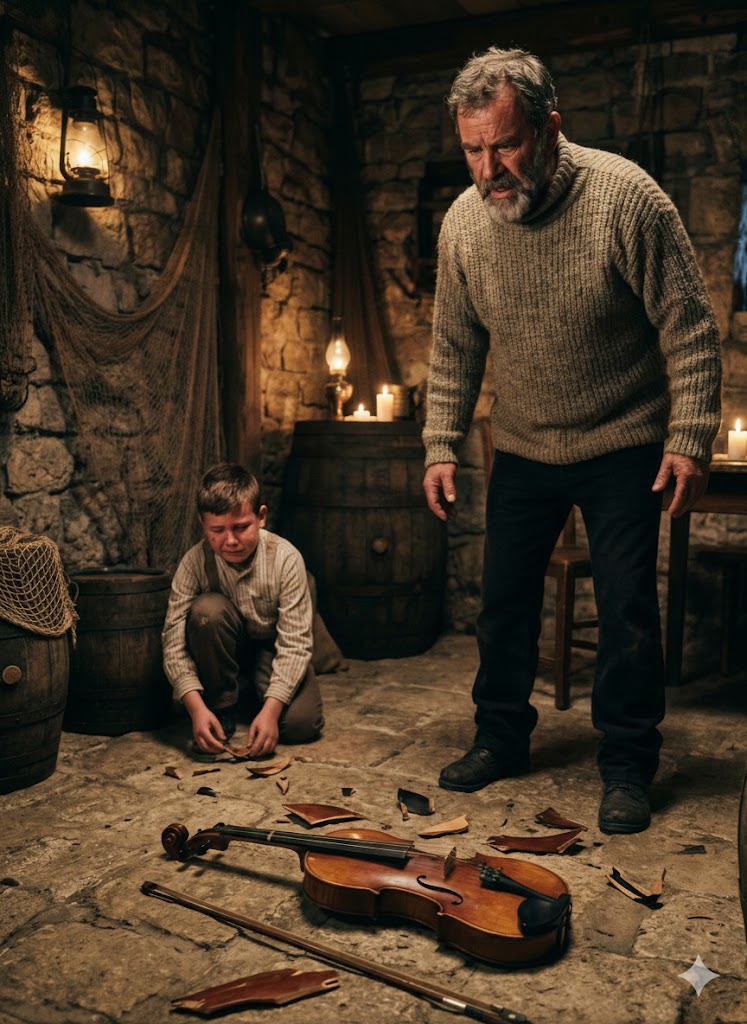 Jedne noći, kada je Jugovo nevreme bilo najjače, Ante se vratio bez ulova. Bio je mokar, umoran i besan. U kući je čuo zvuk violine, Lovro je svirao Vivaldija. Osećajući nakupljeni bes, Ante je ušao u sobu, zahtevao da Lovro prestane. Čuo je samo Lavrovu molbu: „Ne, ćaća! Molim te!“ I tada je bes izbio. Oteo je violinu i snažno je bacio na kamen zid konobe. Drvo je puklo uz jeziv zvuk, a žice su se raspale. Tišina koja je nastala bila je teža od nevremena napolju. Lovro nije rekao ništa. Lice mu je bilo bezizražajno, kamenito. Polako je pokupio svaki komadić violine, spakovao ih u kutiju i otišao u svoju sobu. Sledećeg jutra, Ante je pronašao samo praznu sobu i poruku: „Otišao sam da tražim kruh od muzike. Zbogom, oče.“