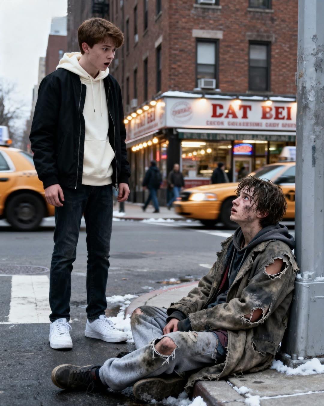 Sjedio je na hladnom betonu, umotan u staru odjeću, sa pogledom koji je istovremeno bio prazan i duboko umoran. Prvi osjećaj bio je nelagoda, gotovo strah, jer je bilo kao da gledam verziju sebe koju nikada nisam upoznao. Njegove riječi su me zaledile kada je primijetio sličnost i tiho je izgovorio da izgledamo isto. Taj susret nije bio običan, jer se u svakom njegovom pokretu ogledalo nešto poznato, a opet potpuno strano.