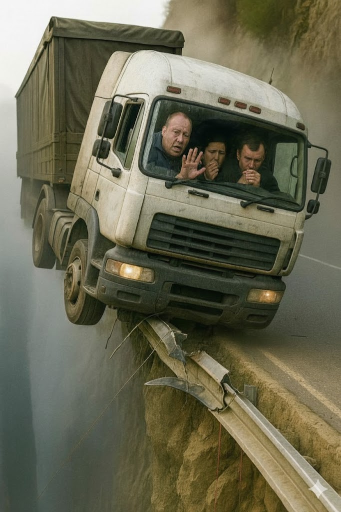 U kabini su se nalazile tri osobe, zarobljene između straha i nade. Vozač, Alex Reed, drhtao je pokušavajući ostati pribran dok je gledao kroz napuklo staklo prema sivom bezdanu ispod sebe. Pored njega je sjedila Elina Moritz, koja je rukama prekrila lice, tiho izgovarajući kratke, prekinute molitve. Na stražnjem sjedalu je bio mladi Liam Novak, stežući sigurnosni pojas tako snažno da su mu prsti pobijelili. Kamion se lagano ljuljao zbog vjetra, svaka sitna vibracija ulijevala je novi val panike u troje ljudi koji su znali da je čak i jedan pogrešan pokret dovoljan da pretegne ravnotežu na stranu smrti.